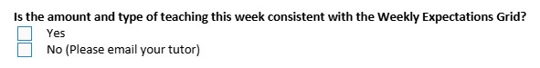 Further details of this week’s activities and responsibilities can be found in the Weekly Expectation grid on p32 of the School Placement 1 Handbook. This is provided as guidance and need not be adhered to if it is not in the interest of the beginning teacher’s learning to teach. If mentors have any concerns regarding the pace at which their trainee is progressing, they should contact the tutor having first ticked the ‘no’ box at the bottom of the weekly review page in beginning teacher’s ePortfolio or asked the beginning teacher to do so: